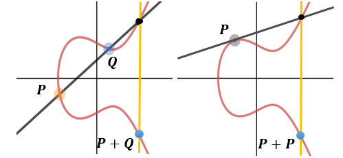 - На эллиптической кривойопределены операции сложения и умножения точек, что позволяет применять их для создания криптографических протоколов.